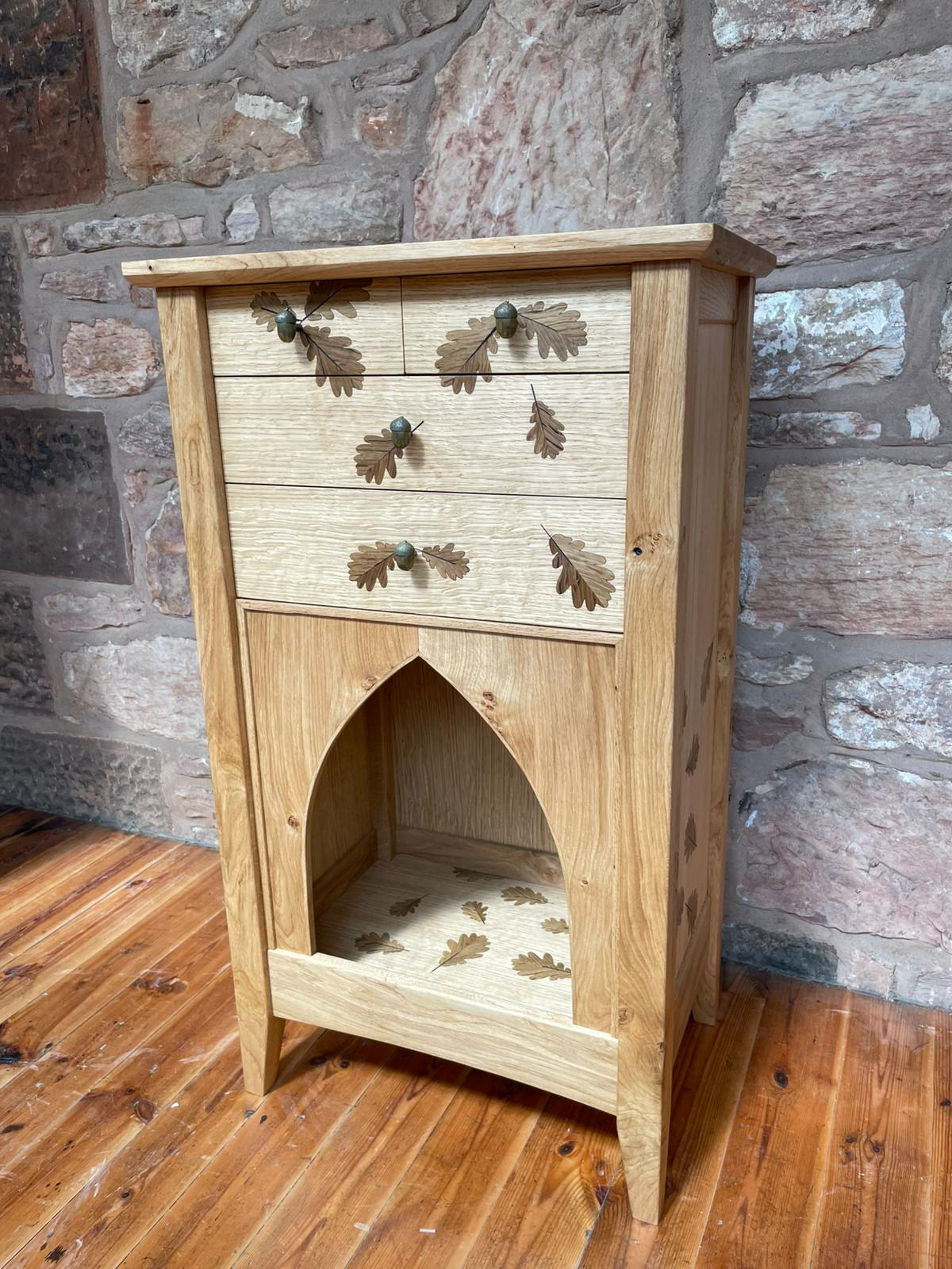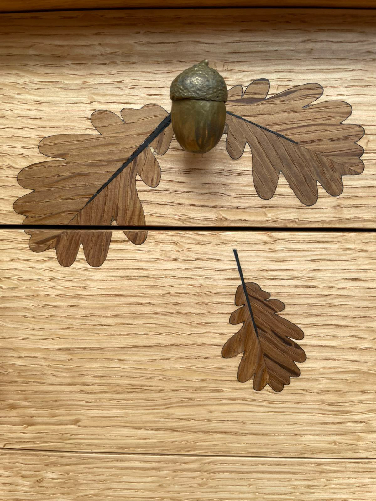 Local oak cabinet with oak veneered panel, fumed oak leaf marquetry and handmade acorn drawer pulls.