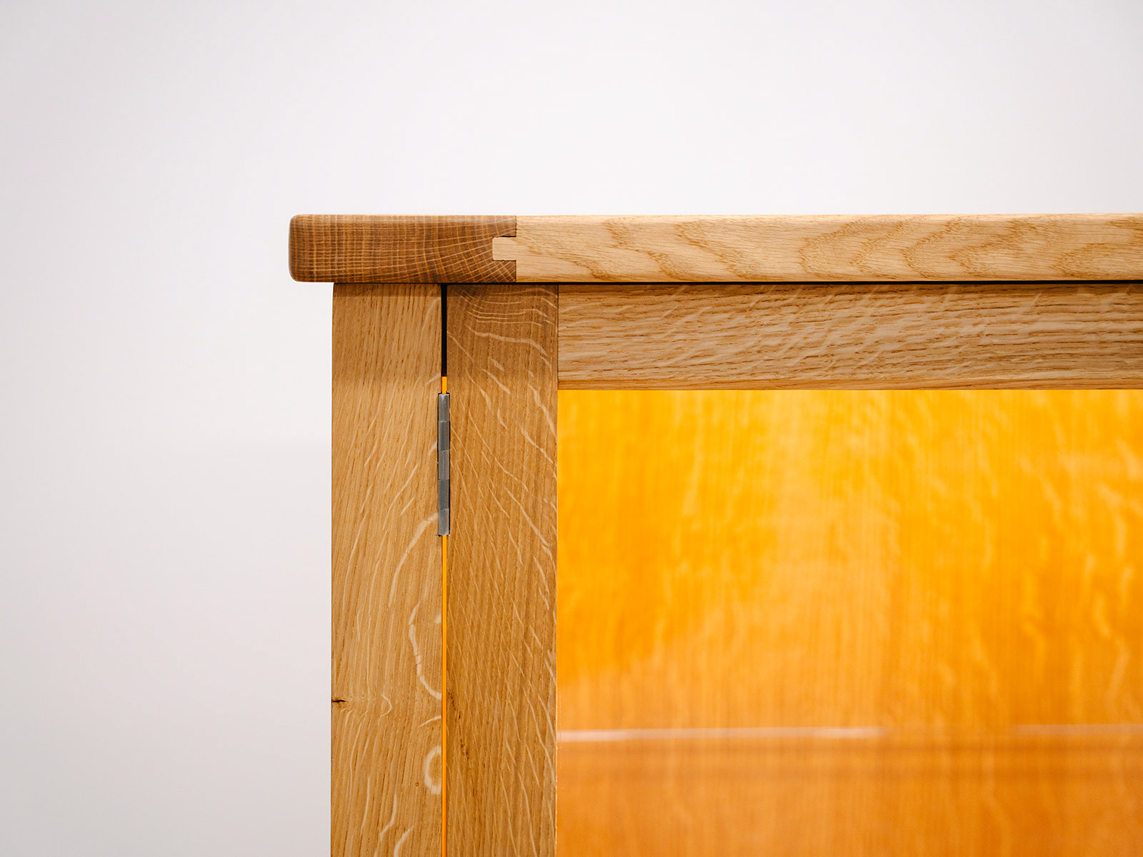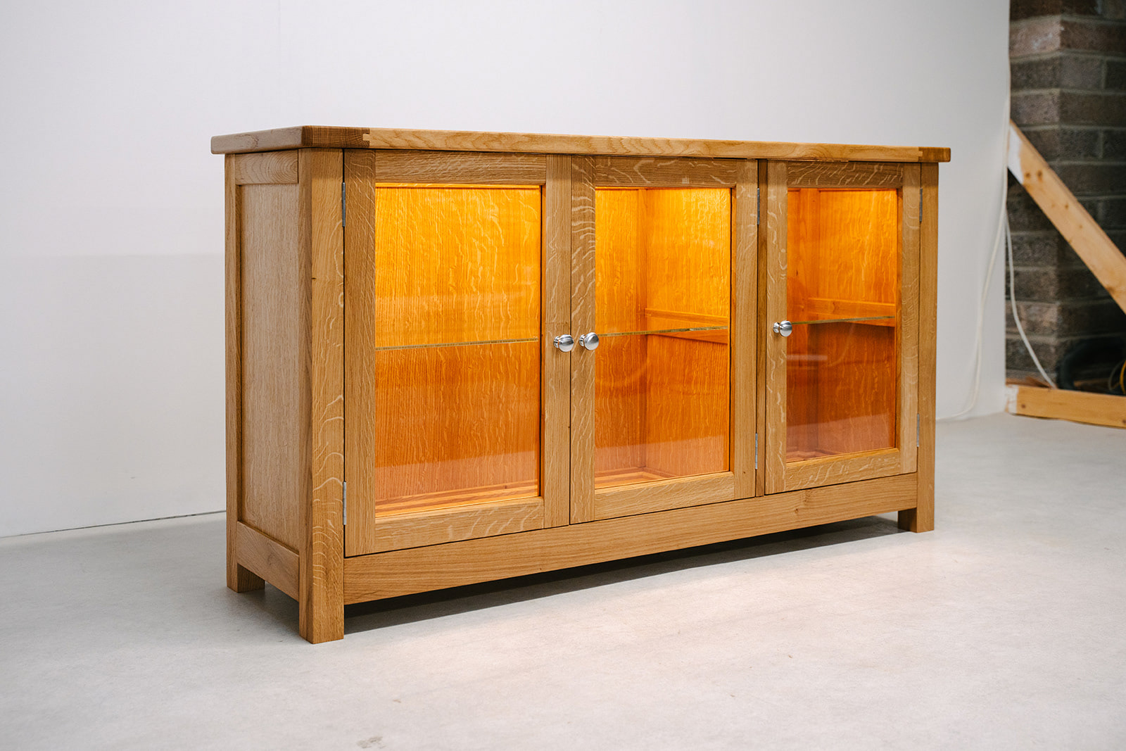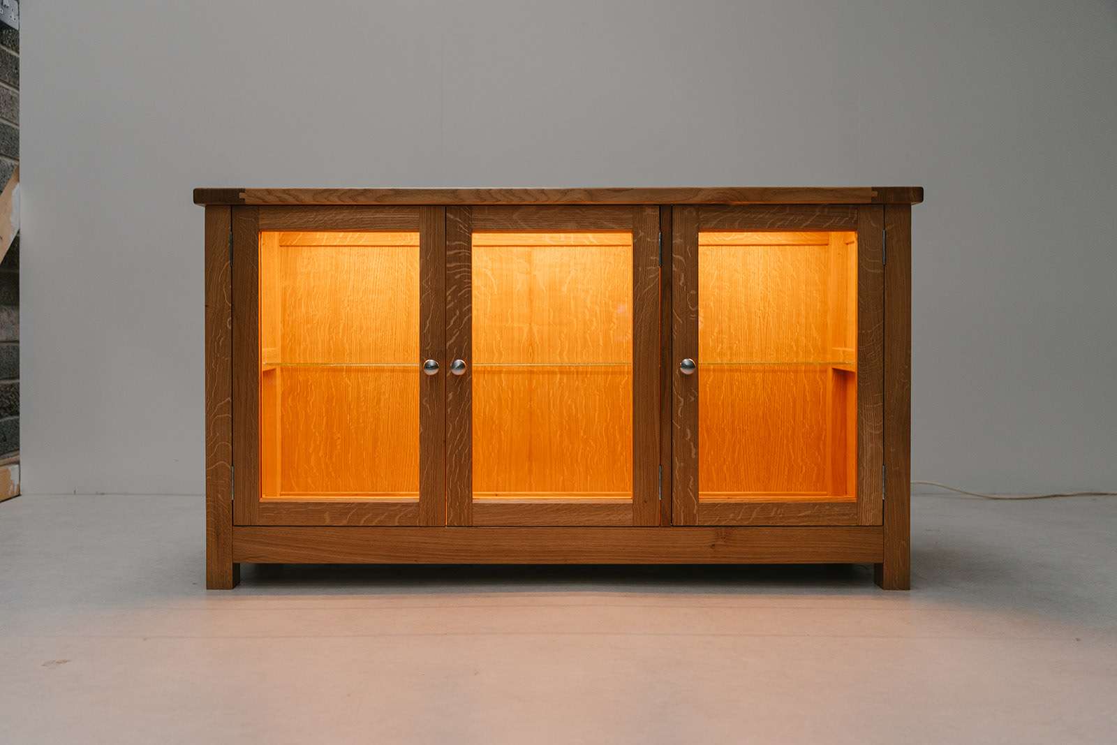 Quarter sawn Scottish oak display cabinet with glass shelving and hidden LED lighting.