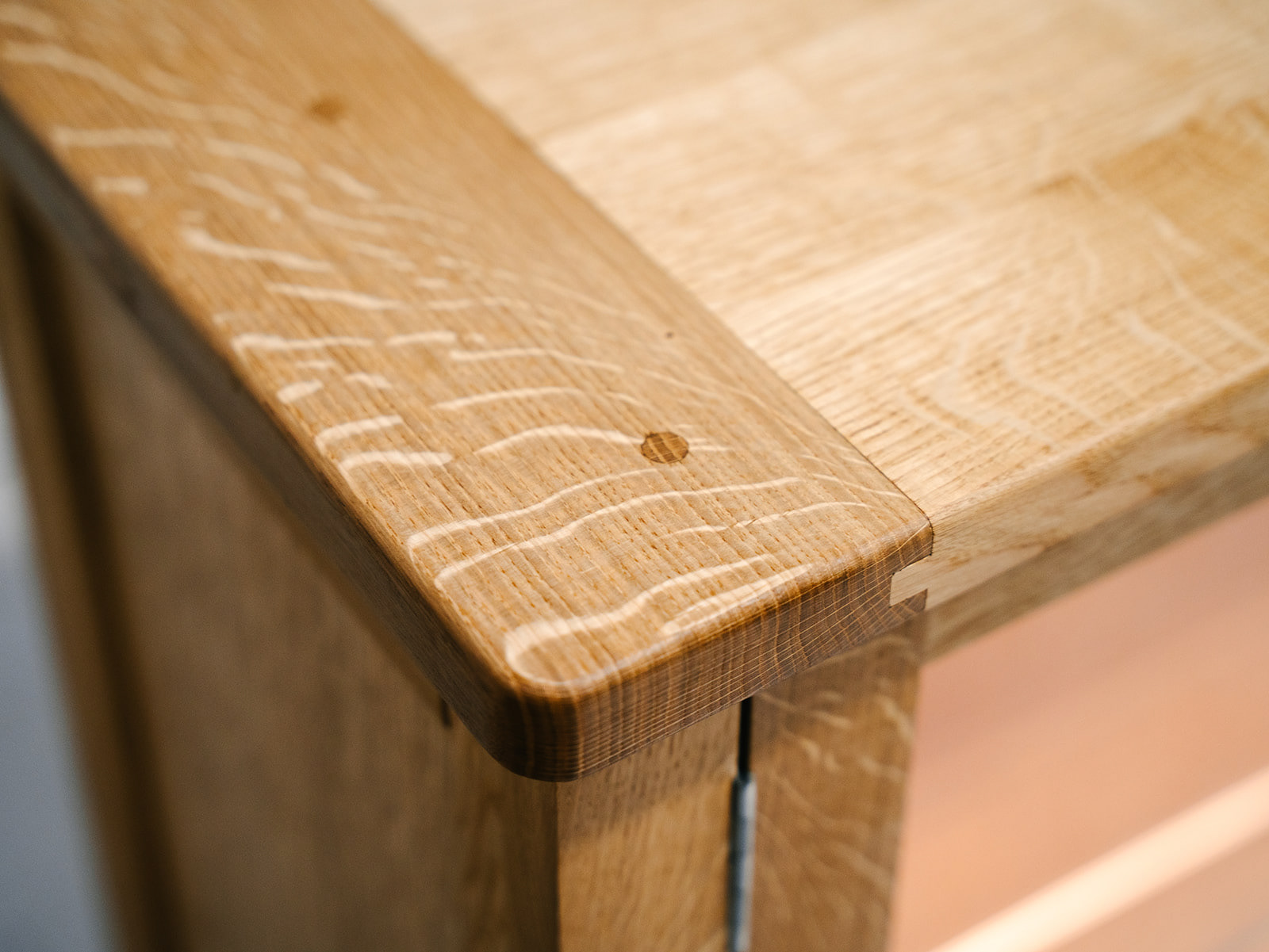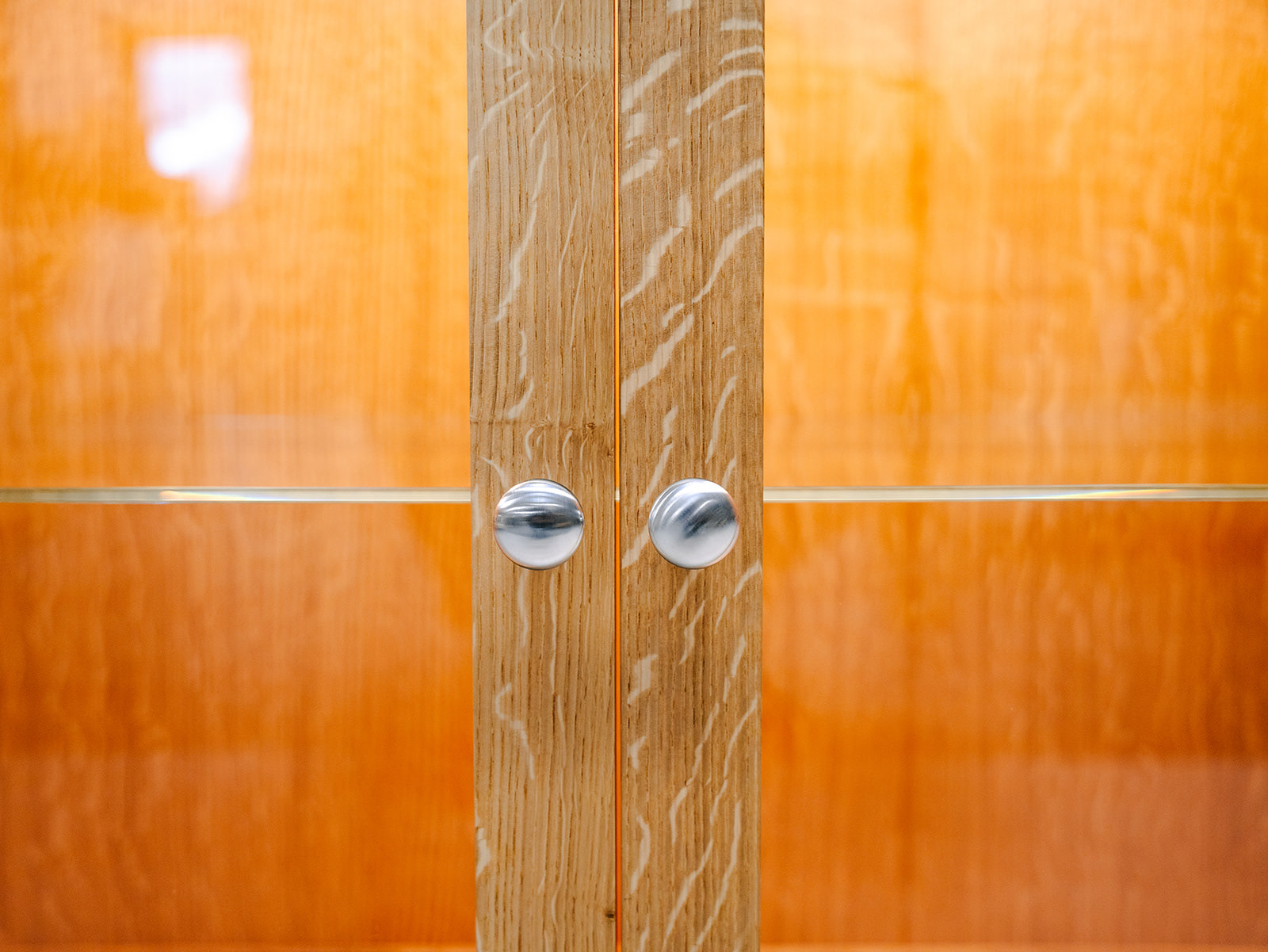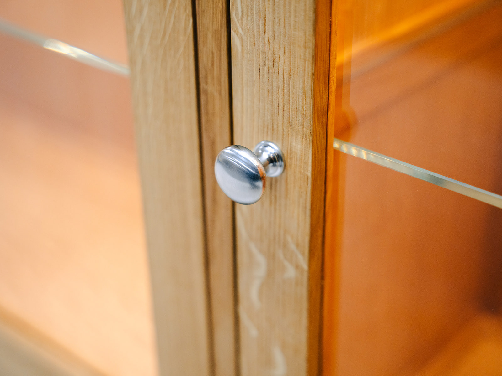 Quarter sawn Scottish oak display cabinet with glass shelving and hidden LED lighting.